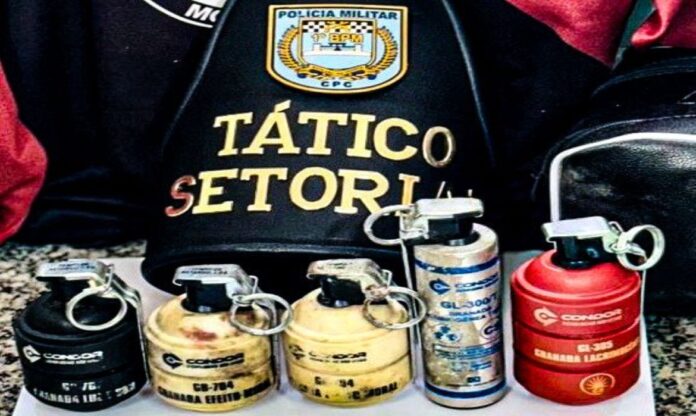 Durante a revista, foram apreendidos dois artefatos de efeito moral, uma lacrimogênea tripla e uma granada de luz e som, todos guardados em uma bolsa.
