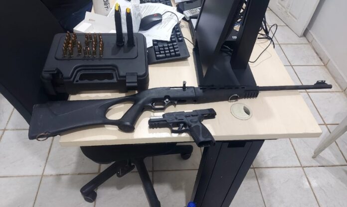 No local, os policiais encontraram uma pistola 9mm e um rifle calibre 22. Além das armas, foram apreendidas munições compatíveis com ambos as armas.